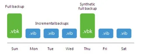 - Vào ngày thực hiện synthetic full hay active full backup, Veeam tạo một bản full backup và thêm bản backup đó vào chain. Các incremental backup tiếp theo sẽ coi bản full này như là khởi đầu của một chuỗi mới.