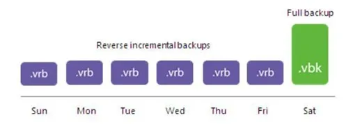 - Trong những lần thực hiện tiếp theo của job, Veeam Backup & Replication chỉ copy những block dữ liệu thay đổi từ lần backup trước. Veeam “tiêm” block dữ liệu được copy vào bản full backup, để làm bản full của VM luôn ở trạng thái mới nhất. Thêm vào đó, Veeam tạo một bản reverse incremental backup (VRB) chứa những block dữ liệu được thay thế khi làm mới bản full backup và thêm bản reverse incremental backup này trước bản full trong chain.