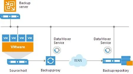 Để giảm bớt workload cho backup server, Veeam sử dụng Backup Proxy. Backup Proxy nằm giữa data source và target, được dùng để xử lý các job và trao đổi backup traffic. Công việc của backup proxy bao gồm lấy dữ liệu của VM từ thiết bị lưu trữ, nén và gửi các dữ liệu đó đến backup repository hoặc đến backup proxy khác. Việc xử lý dữ liệu được giao cho backup proxy nên backup server trở thành trung tâm điều khiển (“point of control”) phân phối các job cho proxy server.