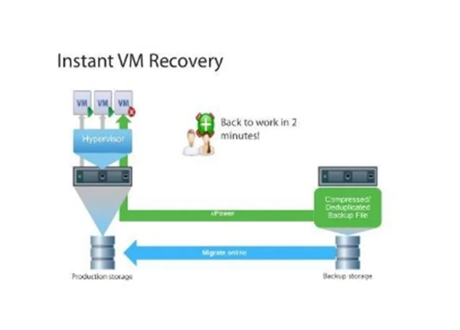 Với Instant VM recovery, ta có thể restore VM vào môi trường doanh nghiệp bằng cách chạy trực tiếp từ backup file. Instant VM recovery giúp cải thiện thời gian khôi phục (RTO), tối thiểu hóa downtime của VM. Nó giống như có môt bản sao tạm thời của VM: Người dùng vẫn có thể hoạt động bình thường trong khi sửa VM bị lỗi.