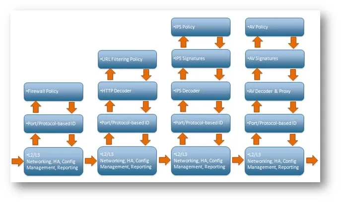 User-ID, App-ID, và policy engine được xử lý bởi multicore security processor, với phần cứng được thiết kế để tăng tốc mã hóa, giải mã và giải nén.