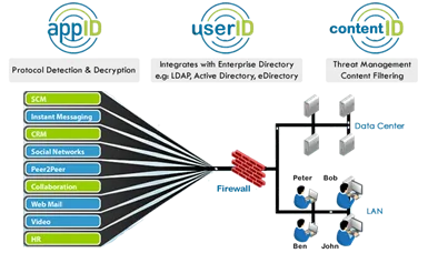 User-ID: Tích hợp với Microsoft Active Directory kết nối địa chỉ IP với người dùng, nhóm cho phép phòng IT kiểm soát ứng dụng, nội dung dựa trên thong tin nhân viên được lưu trong Active Directory. User-ID cho phép nhà quản trị kết hợp thông tin người dùng với ứng dụng, tạo policy, log dữ liệu và báo cáo.