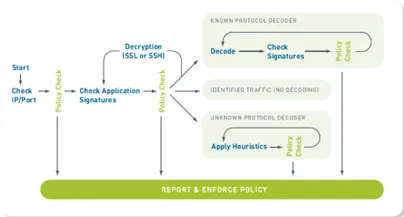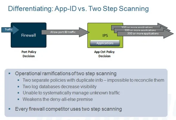 Các tường lửa khác: Các tường lửa khác được xây dựng trên nền tảng kiến trúc cũ, phần nhận diện ứng dụng chỉ là một lớp được bổ sung ở phía sau modul tường lửa truyền thống. Dữ liệu trước khi được nhận dạng ứng dụng vẫn được phân loại và xử lý theo cổng, giao thức truyền thống. Và công nghệ nhận dạng vẫn dựa hoàn toàn vào việc so sánh với mẫu trong cơ sở dữ liệu.