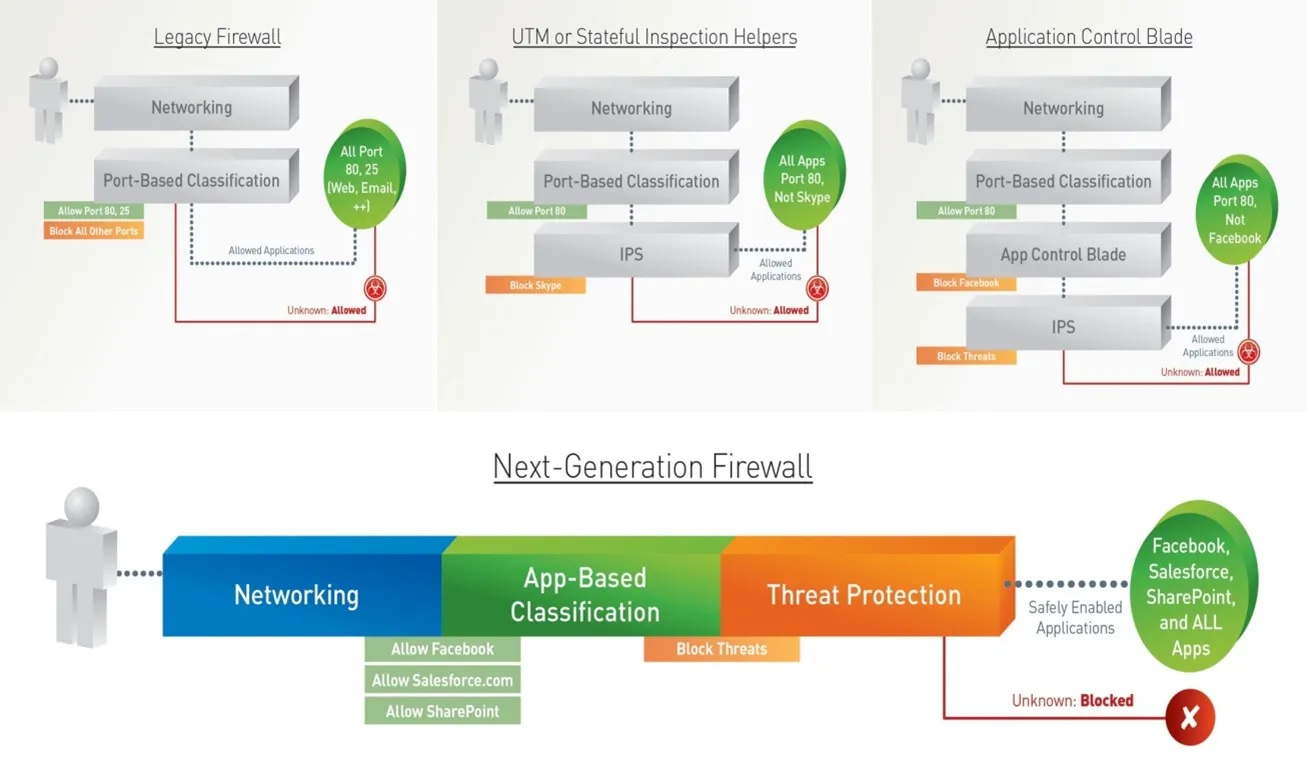 Các tường lửa khác: Do về cơ bản vẫn là tường lửa truyền thống, module nhận dạng ứng dụng chỉ được thêm vào phía sau và hoạt động theo cơ chế của IPS tức là chỉ kiểm soát những gì nó biết còn những gì không biết sẽ được cho qua. Do đó nếu các ứng dụng không xác định này hoạt động trên dải cổng hoặc giao thức mà lớp tường lửa truyền thống cho phép thì các ứng dụng này sẽ đi qua hệ thống mà không được phát hiện hay ghi nhận.