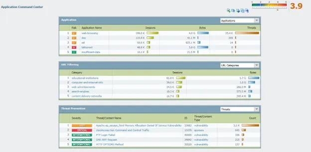 ACC - Application Command Center là một giao diện tương tác của Palo Alto cho phép người quản trị tìm kiếm, phân tích tất cả các thông tin về một đối tượng trên hệ thống. Ở giao diện chính, ACC liệt kê TOP các ứng dụng, người dùng, địa chỉ đích, Threat, Data filtering, URL có trên hệ thống.