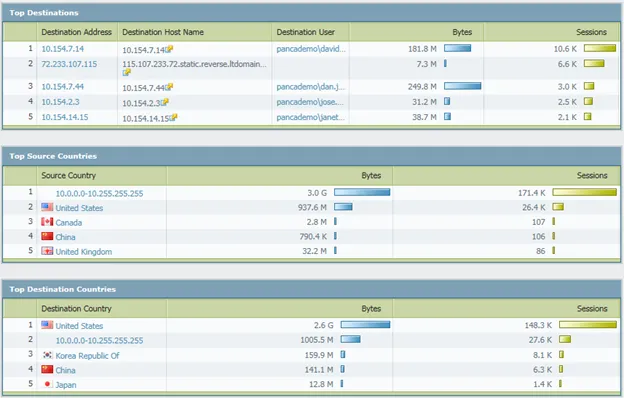 Tiếp theo là top các địa chỉ đích, mà người dùng sử dụng ứng dụng Web Browsing truy cập đến cùng thông tin quy đổi từ địa chỉ IP sang vùng địa lý (Source Countries, Destination Countries).