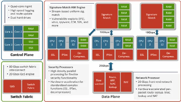 Management: việc cấu hình, looging, và reporting được thực hiện thông qua bộ xử lý dành riêng cho control plane, riêng biệt với data plane để xử lý dữ liệu.