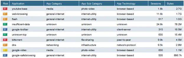 Application usage: cho phép report các loại ứng dụng mà người dùng đó sử dụng cùng với chi tiết về category, băng thông, số lượng session và mức độ nguy hiểm của ứng dụng đó.